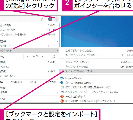 Chromeでブックマークをインポートするためには、以下の手順を踏みます。