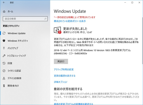 - 「Windows Update」のページで、「更新履歴」をクリックします。