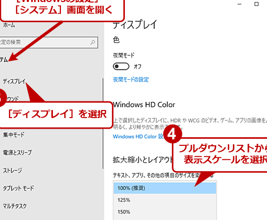 ディスプレイ設定で画面の表示サイズを変更することができます。設定アプリを開き、「システム」→「ディスプレイ」を選択します。そこで、スケールの設定を変更することができます。