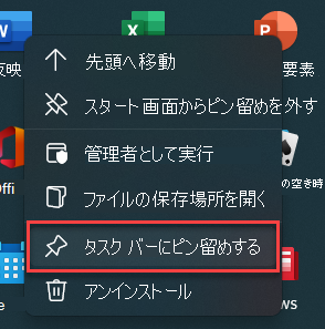 - タスクバーにあるアイコンを右クリックし、「ピン留め」を選択する