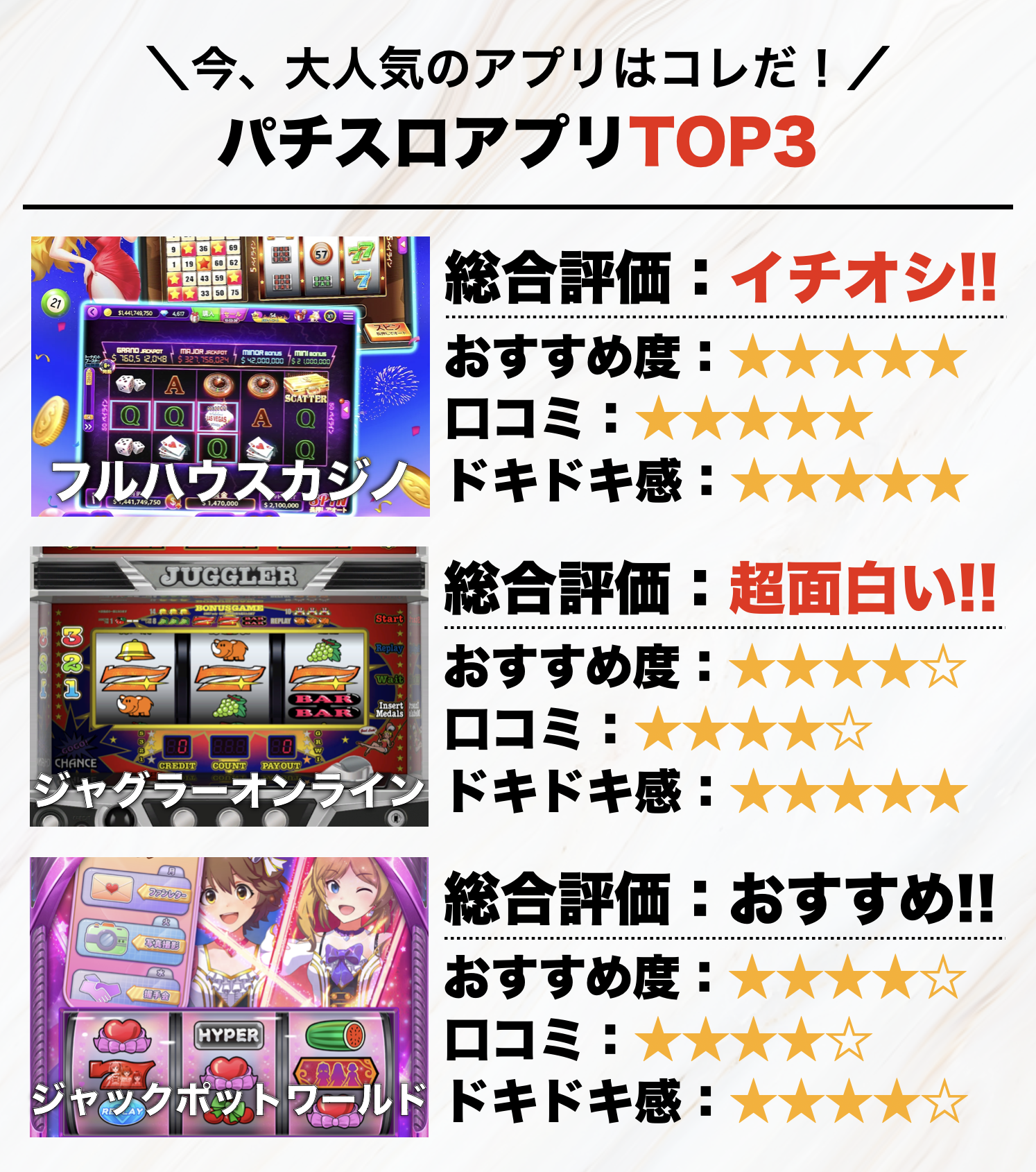 - パチスロジャックポット:パチスロジャックポットは、パチスロアプリのトップ9にランクインしています。