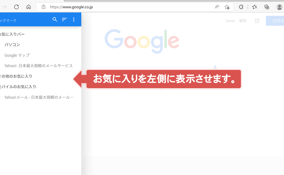 エッジブラウザーを再起動し、お気に入りが左側に表示されていることを確認します。